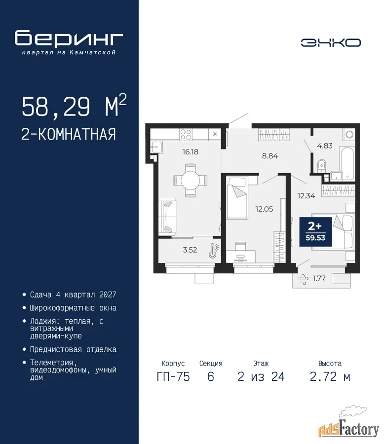 Дом монолитный, многоподъездный, переменной этажности, от 17 до 24 этажей. Квартира находится в 6-й секции высотой 24 этажа в корпусе ГП-75. На этаже 6 квартир. В подъезде 2 пассажирских и 1 грузовой лифт. Окончание строительства - 4 квартал 2027 года. Оформление сделки по договору долевого участия.