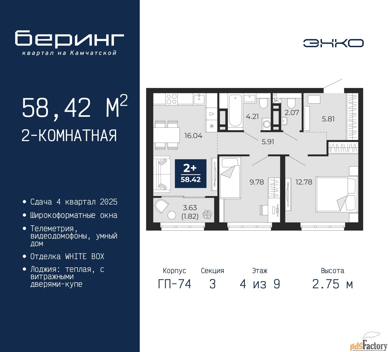 Дом монолитный, многоподъездный, переменной этажности, от 9 до 21 этажей. Квартира находится в 3-й секции высотой 9 этажей в корпусе ГП-74. На этаже 7 квартир. В подъезде 1 грузовой лифт. Окончание строительства - 4 квартал 2025 года. Оформление сделки по договору долевого участия.