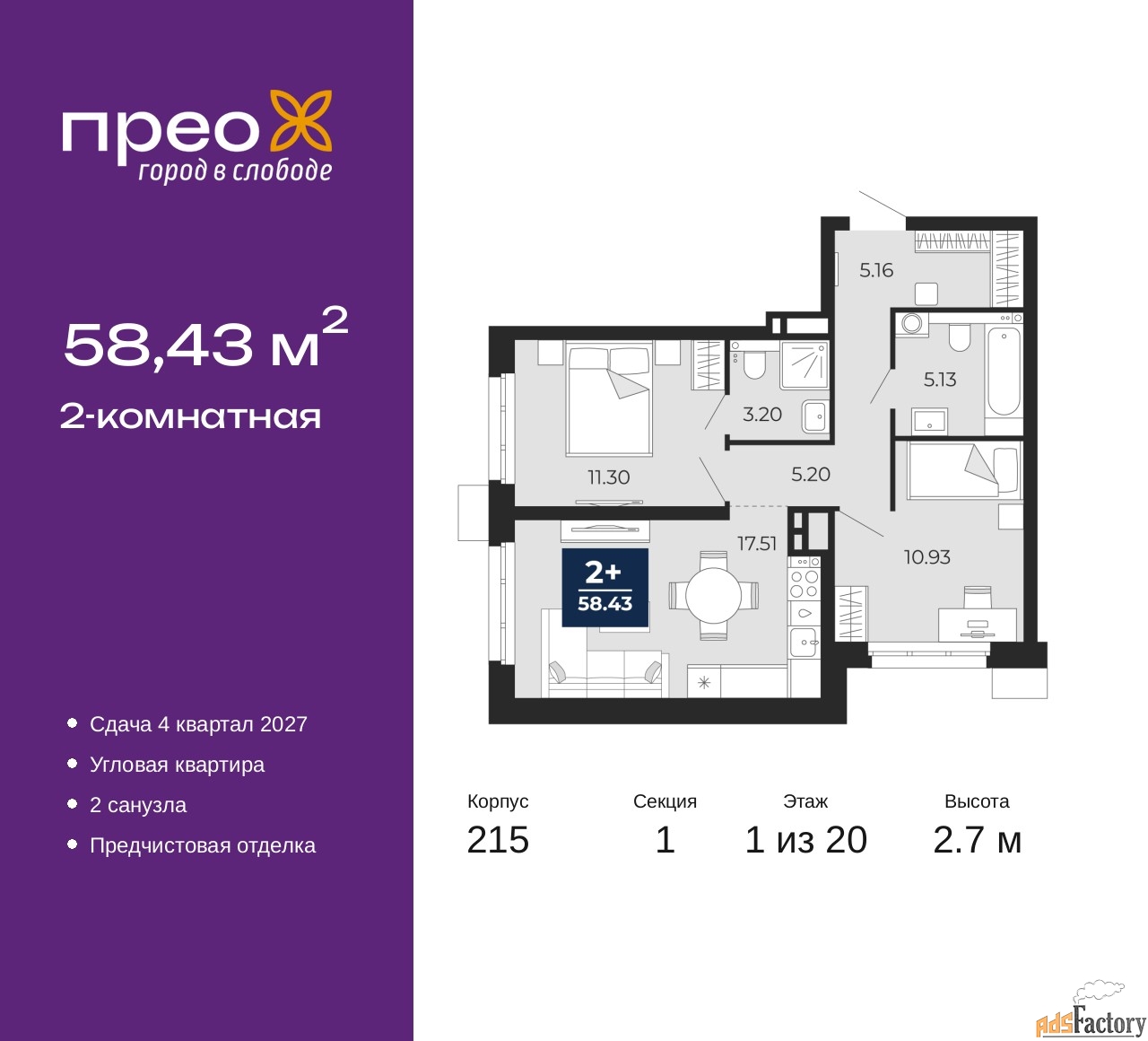 Квартира находится в корпусе 215. Дом монолитный, одноподъездный, высотой 20 этажей. На этаже 8 квартир. В подъезде 1 пассажирский и 1 грузовой лифт. Окончание строительства - 4 квартал 2027 года. Оформление сделки по договору долевого участия.