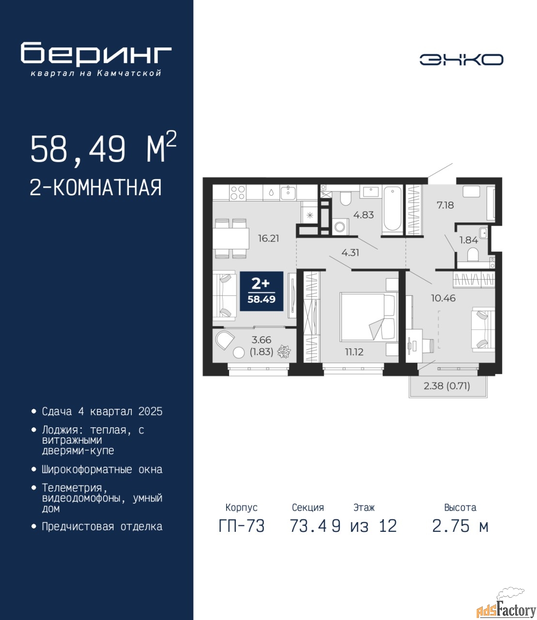 Дом монолитный, многоподъездный, переменной этажности, от 9 до 22 этажей. Квартира находится в 73.4-й секции высотой 12 этажей в корпусе ГП-73. На этаже 8 квартир. В подъезде 1 пассажирский и 1 грузовой лифт. Окончание строительства - 4 квартал 2025 года. Оформление сделки по договору долевого участия.