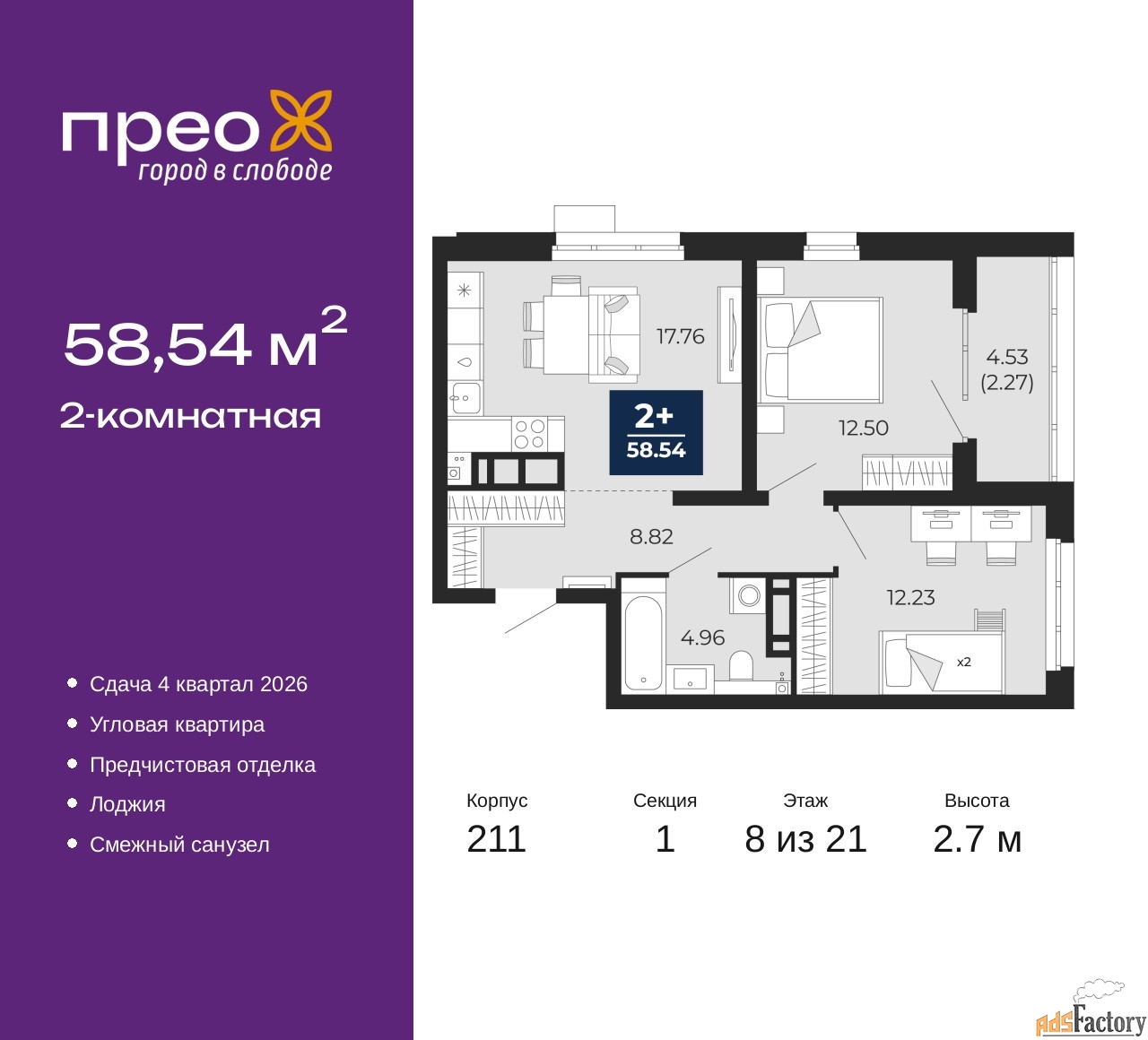 Дом монолитный, черырехподъездный, переменной этажности, от 14 до 21 этажей. Квартира находится в 1-й секции высотой 21 этаж в корпусе 211. На этаже 8 квартир. В подъезде 1 пассажирский и 1 грузовой лифт. Окончание строительства - 4 квартал 2026 года. Оформление сделки по договору долевого участия.