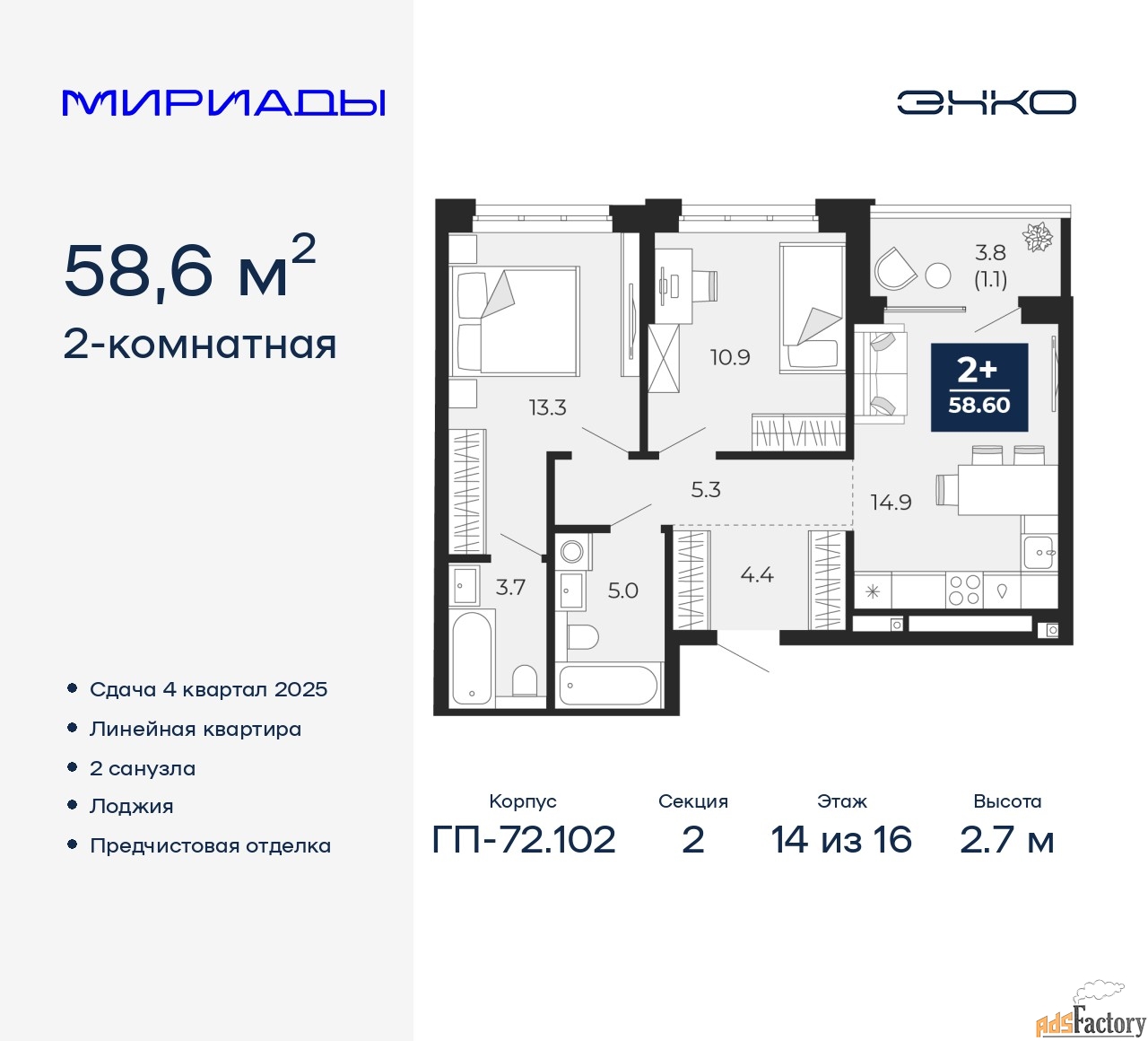 Дом монолитный, многоподъездный, переменной этажности, от 14 до 16 этажей. Квартира находится во 2-й секции высотой 16 этажей в корпусе ГП-72.102. На этаже 6 квартир. В подъезде 1 пассажирский и 1 грузовой лифт. Окончание строительства - 4 квартал 2025 года. Оформление сделки по договору долевого участия.