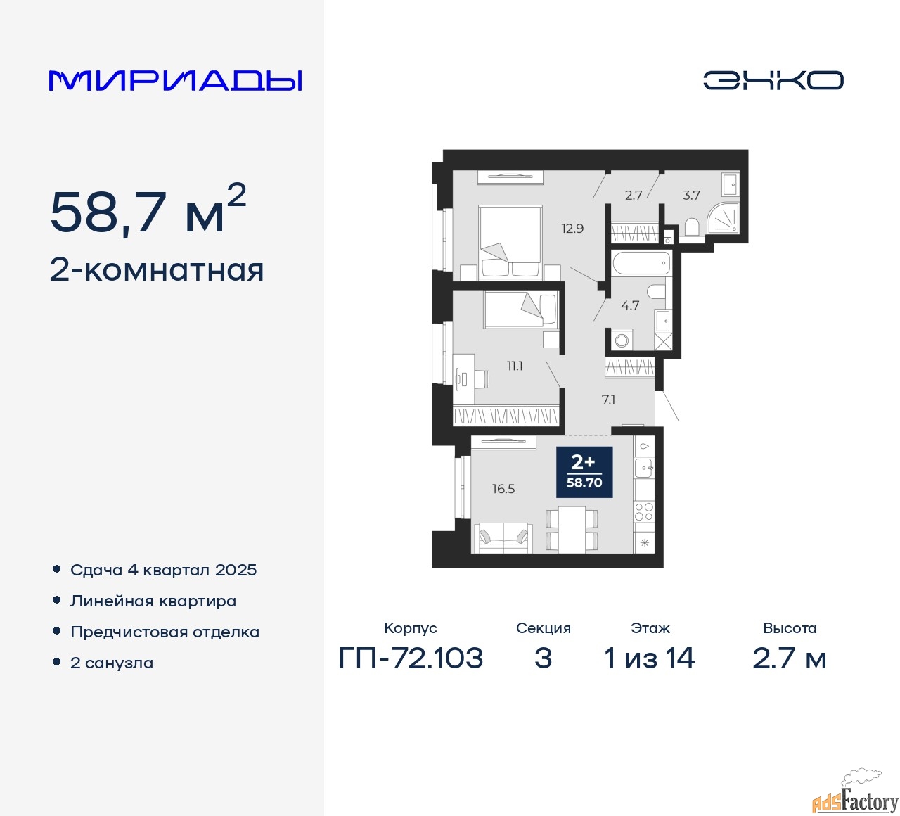 Высота потолков (м.) | 2.7 |