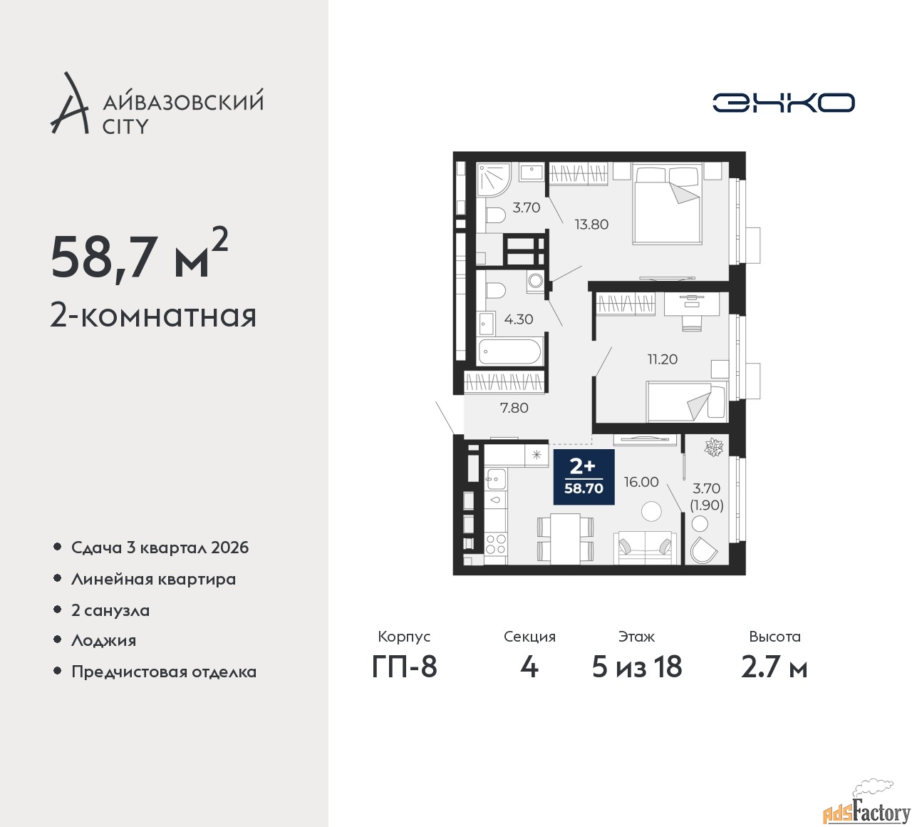 Дом монолитный, многоподъездный, переменной этажности, от 14 до 24 этажей. Квартира находится в 4-й секции высотой 18 этажей в корпусе ГП-8. На этаже 6 квартир. В подъезде 1 пассажирский и 1 грузовой лифт. Окончание строительства - 3 квартал 2026 года. Оформление сделки по договору долевого участия.