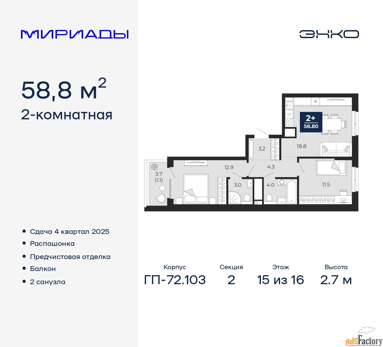 | Высота потолков (м.) | 2.7 |