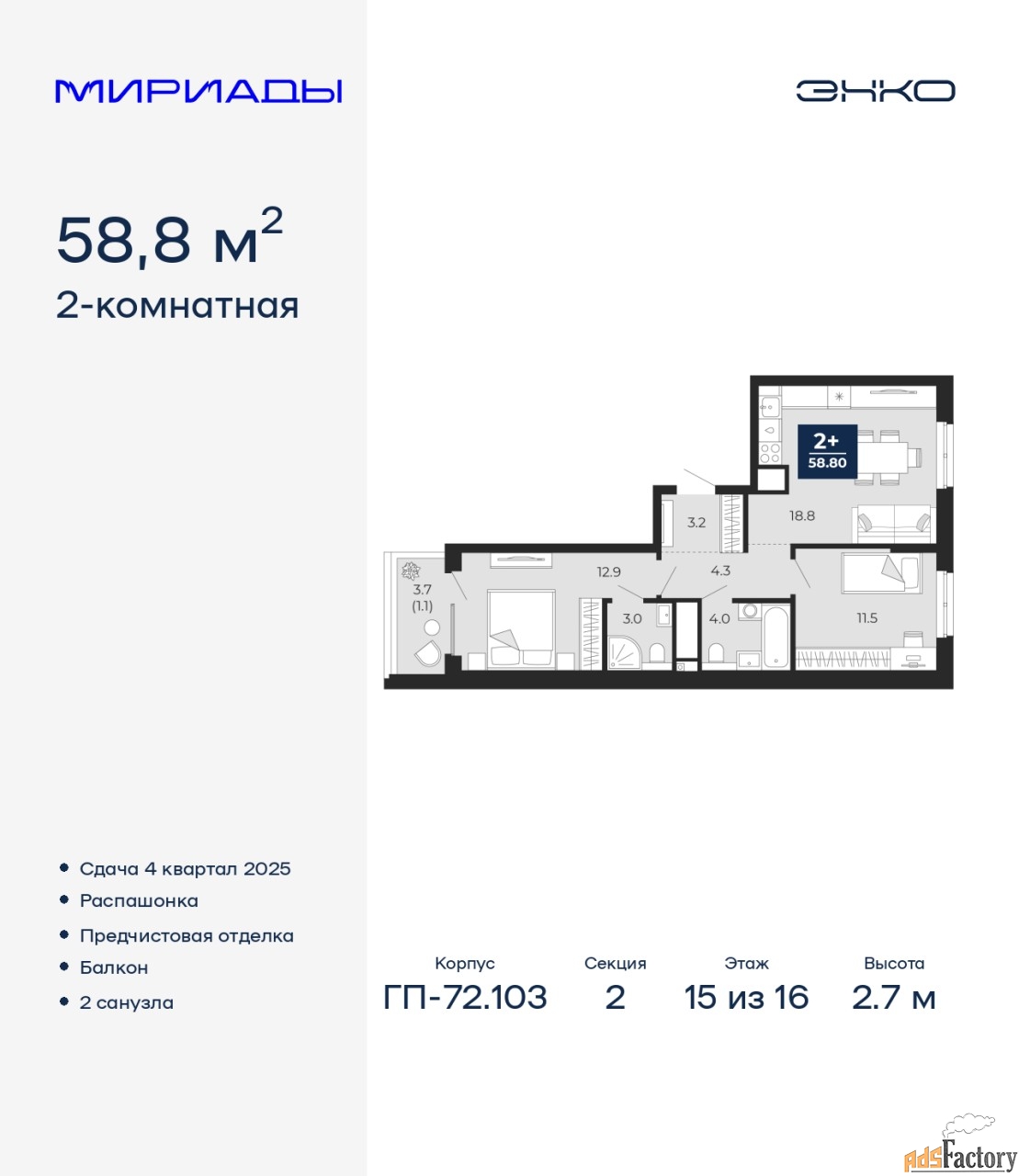 Дом монолитный, трехподъездный, переменной этажности, от 14 до 16 этажей. Квартира находится во 2-й секции высотой 16 этажей в корпусе ГП-72.103. На этаже 6 квартир. В подъезде 1 пассажирский и 1 грузовой лифт. Окончание строительства - 1 квартал 2026 года. Оформление сделки по договору долевого участия.
