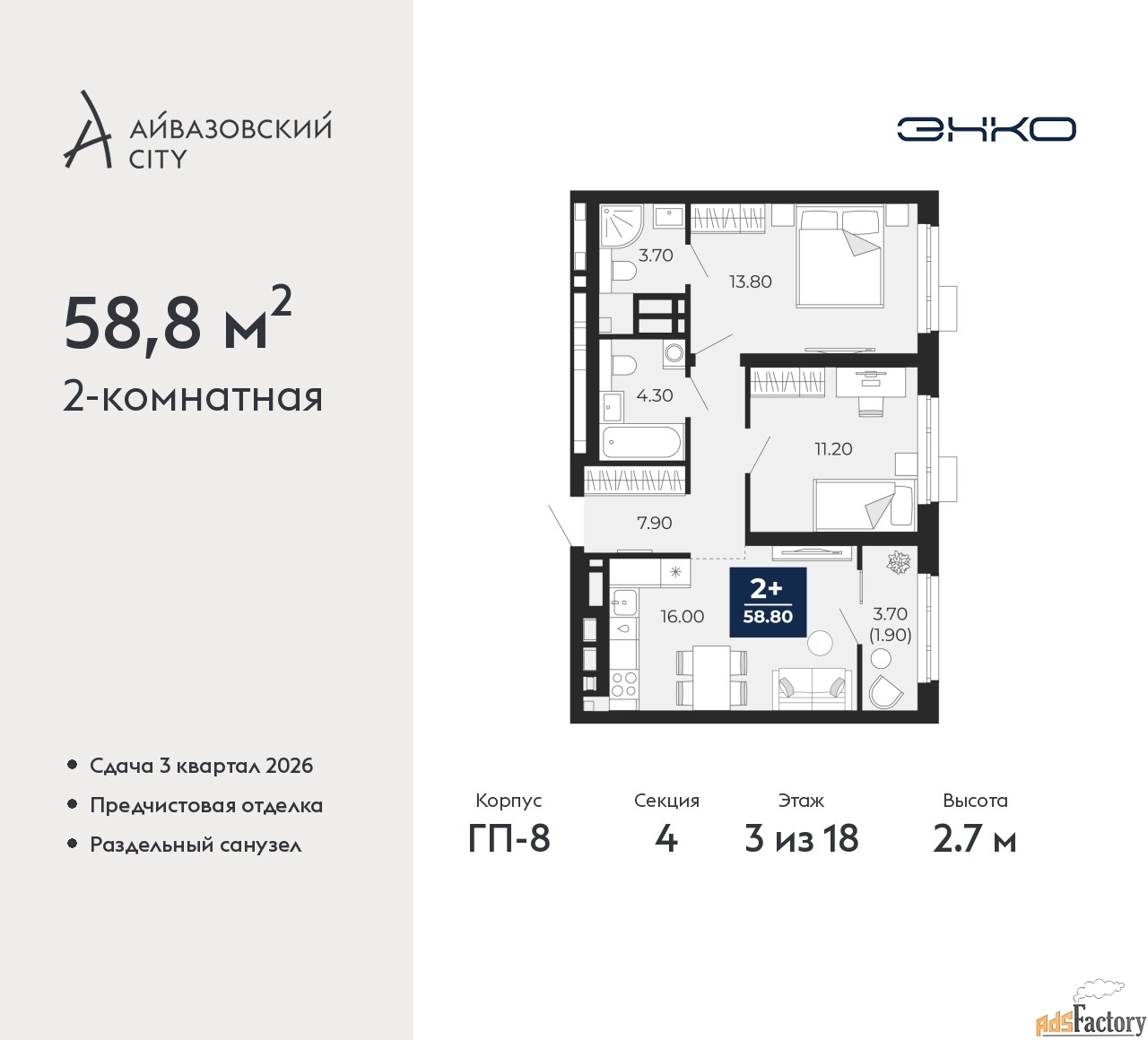 Дом монолитный, многоподъездный, переменной этажности, от 14 до 24 этажей. Квартира находится в 4-й секции высотой 18 этажей в корпусе ГП-8. На этаже 6 квартир. В подъезде 1 пассажирский и 1 грузовой лифт. Окончание строительства - 3 квартал 2026 года. Оформление сделки по договору долевого участия.