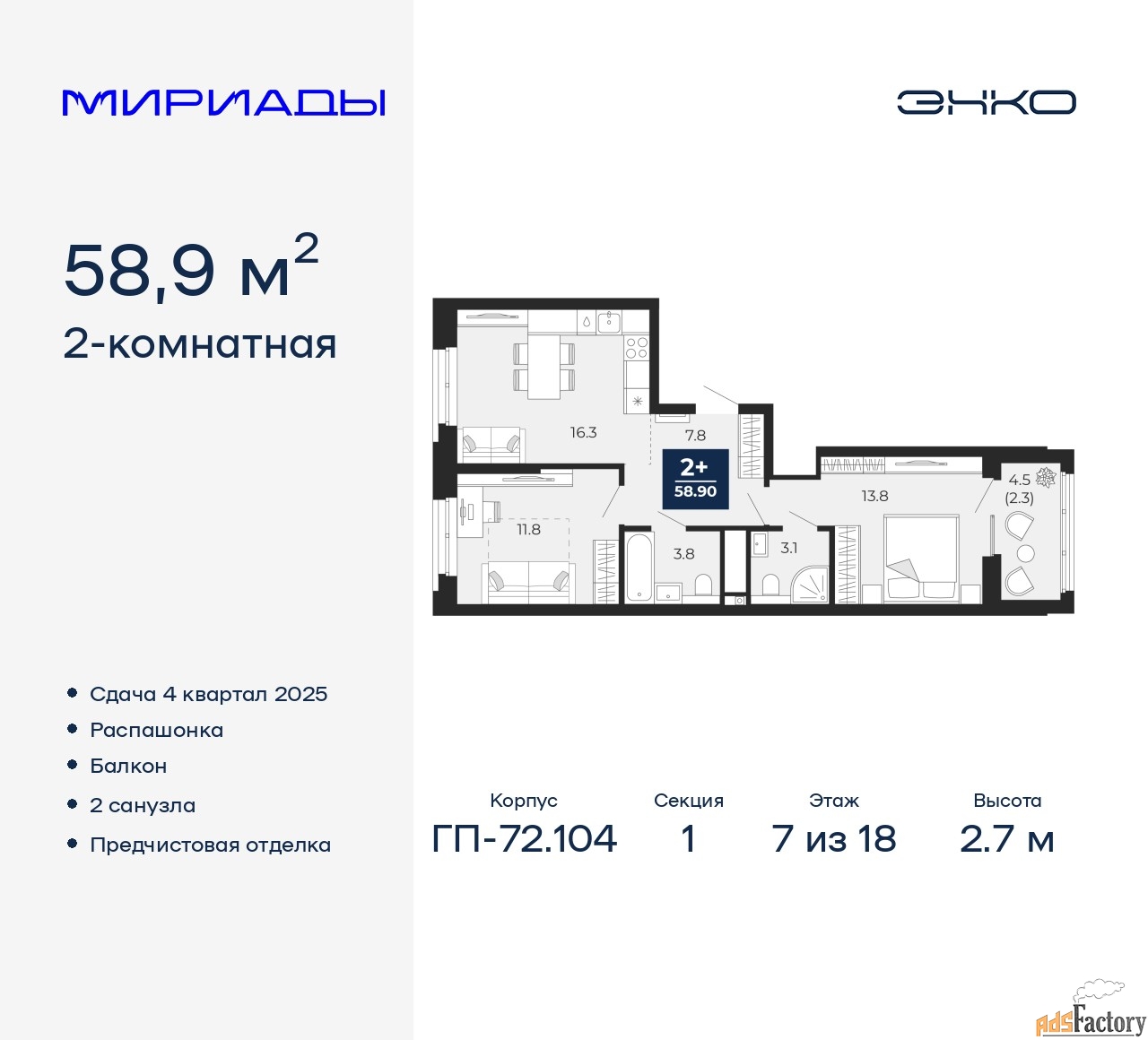 Дом монолитный, двухподъездный, переменной этажности, от 14 до 18 этажей. Квартира находится в 1-й секции высотой 18 этажей в корпусе ГП-72.104. На этаже 6 квартир. В подъезде 1 пассажирский и 1 грузовой лифт. Окончание строительства - 4 квартал 2025 года. Оформление сделки по договору долевого участия.