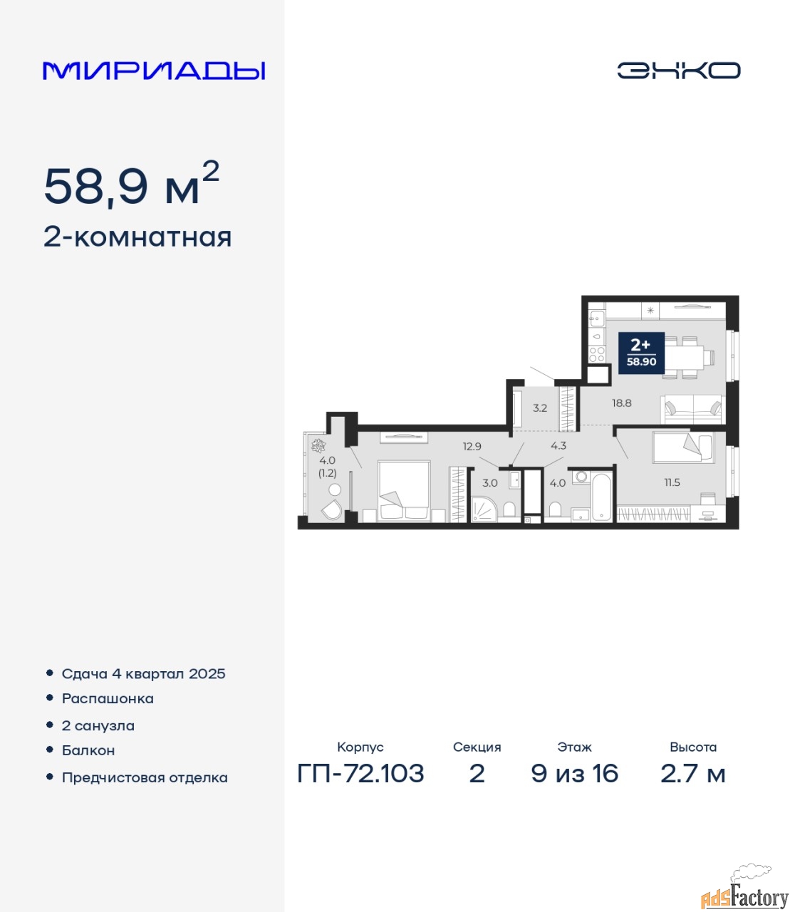 | Общая площадь (кв.м) | 58.9 |