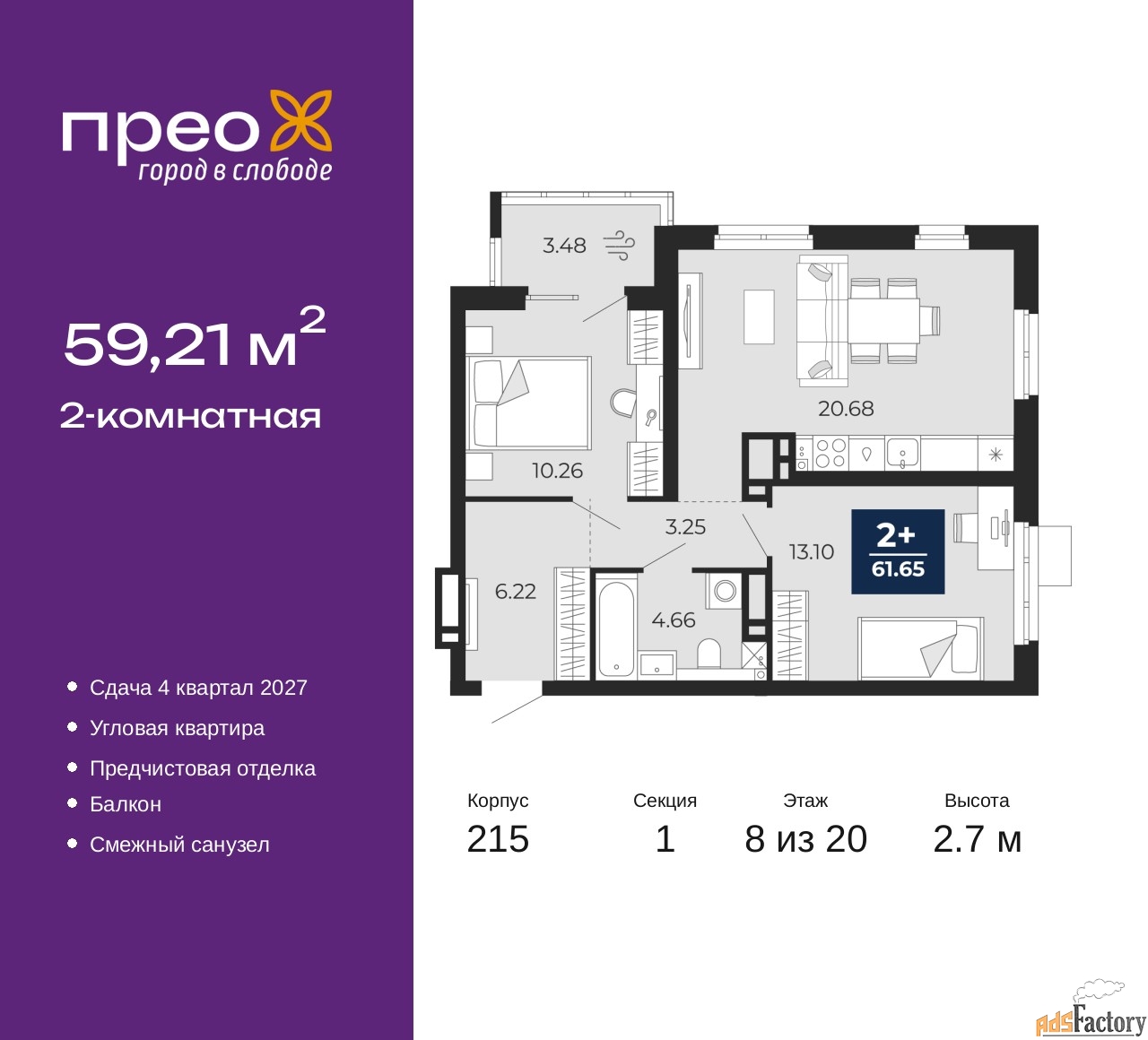 Квартира находится в корпусе 215. Дом монолитный, одноподъездный, высотой 20 этажей. На этаже 8 квартир. В подъезде 1 пассажирский и 1 грузовой лифт. Окончание строительства - 4 квартал 2027 года. Оформление сделки по договору долевого участия.