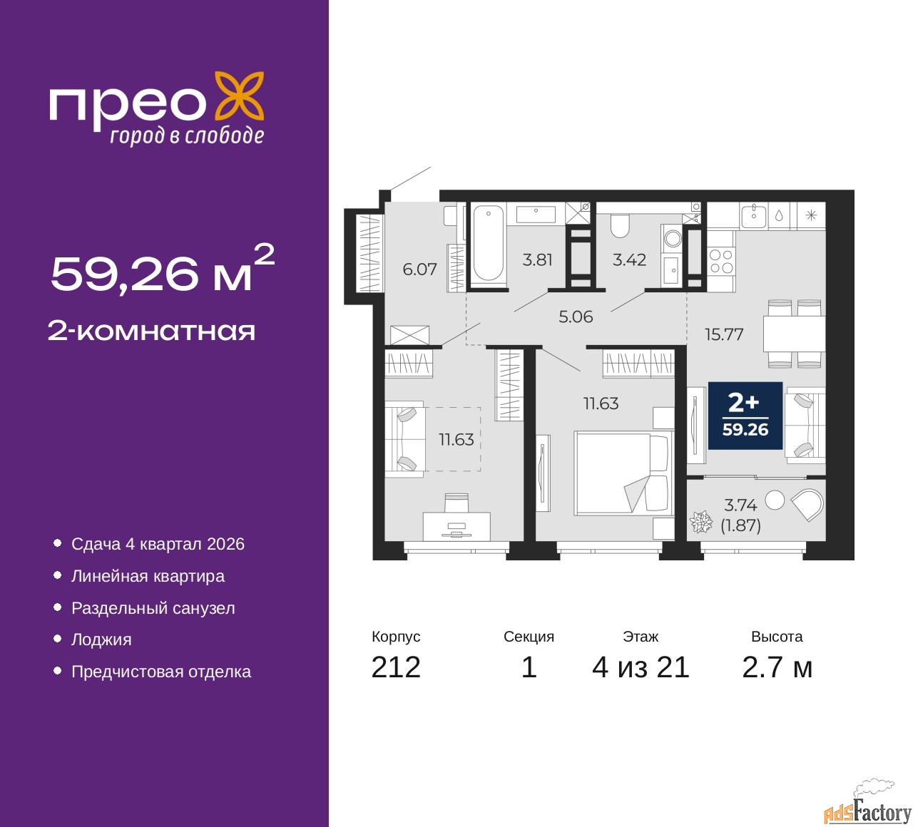 Квартира находится в корпусе 212. Дом монолитный, одноподъездный, высотой 21 этаж. На этаже 8 квартир. В подъезде 2 пассажирских и 1 грузовой лифт. Окончание строительства - 4 квартал 2026 года. Оформление сделки по договору долевого участия.