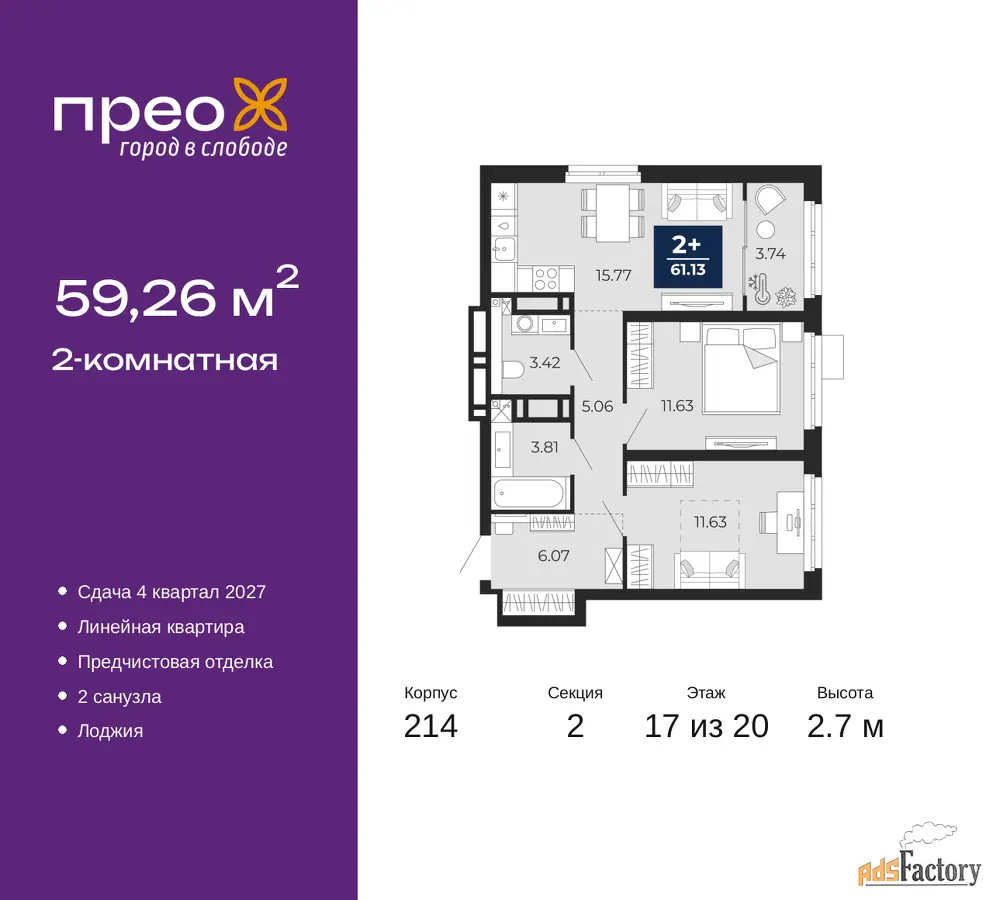 Дом монолитный, двухподъездный, переменной этажности, от 12 до 20 этажей. Квартира находится во 2-й секции высотой 20 этажей в корпусе 214. На этаже 8 квартир. В подъезде 1 пассажирский и 1 грузовой лифт. Окончание строительства - 4 квартал 2027 года. Оформление сделки по договору долевого участия.