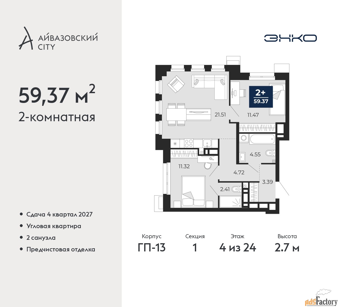 Дом монолитный, многоподъездный, высотой 24 этажа. Квартира находится в 1-й секции в корпусе ГП-13. На этаже 2 квартиры. Окончание строительства - 4 квартал 2027 года. Оформление сделки по договору долевого участия.