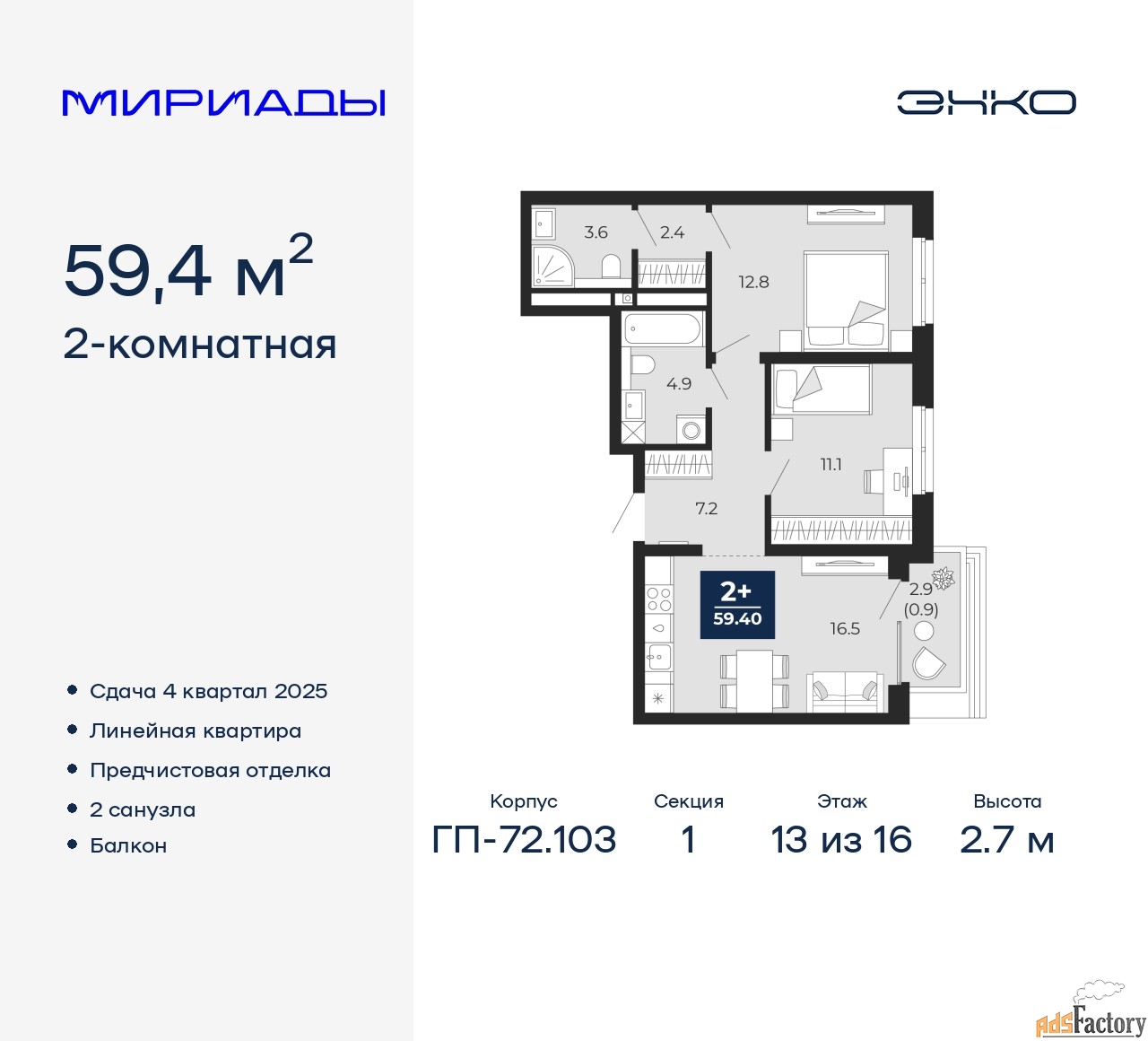 Дом монолитный, трехподъездный, переменной этажности, от 14 до 16 этажей. Квартира находится в 1-й секции высотой 16 этажей в корпусе ГП-72.103. На этаже 8 квартир. В подъезде 1 пассажирский и 1 грузовой лифт. Окончание строительства - 4 квартал 2025 года. Оформление сделки по договору долевого участия.