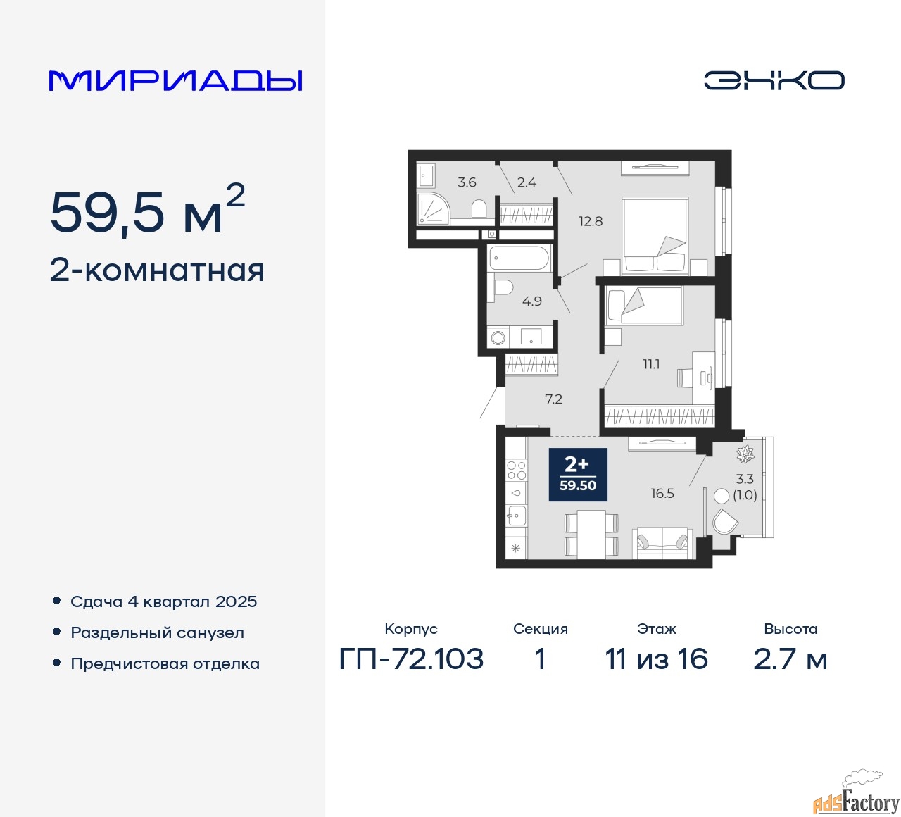Дом монолитный, трехподъездный, переменной этажности, от 14 до 16 этажей. Квартира находится в 1-й секции высотой 16 этажей в корпусе ГП-72.103. На этаже 8 квартир. В подъезде 1 пассажирский и 1 грузовой лифт. Окончание строительства - 4 квартал 2025 года. Оформление сделки по договору долевого участия.