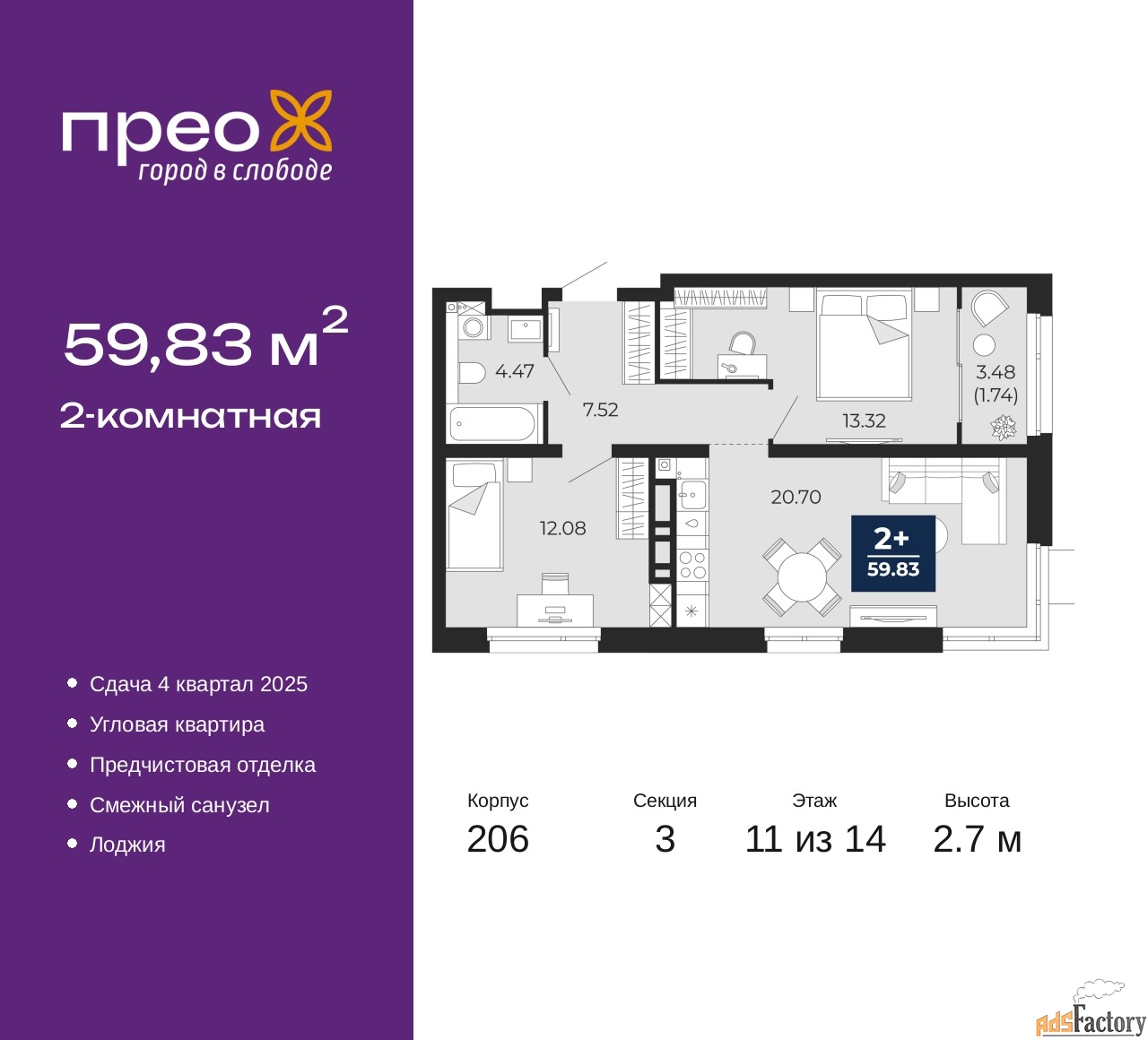 | Общая площадь (кв.м) | 59.83 |