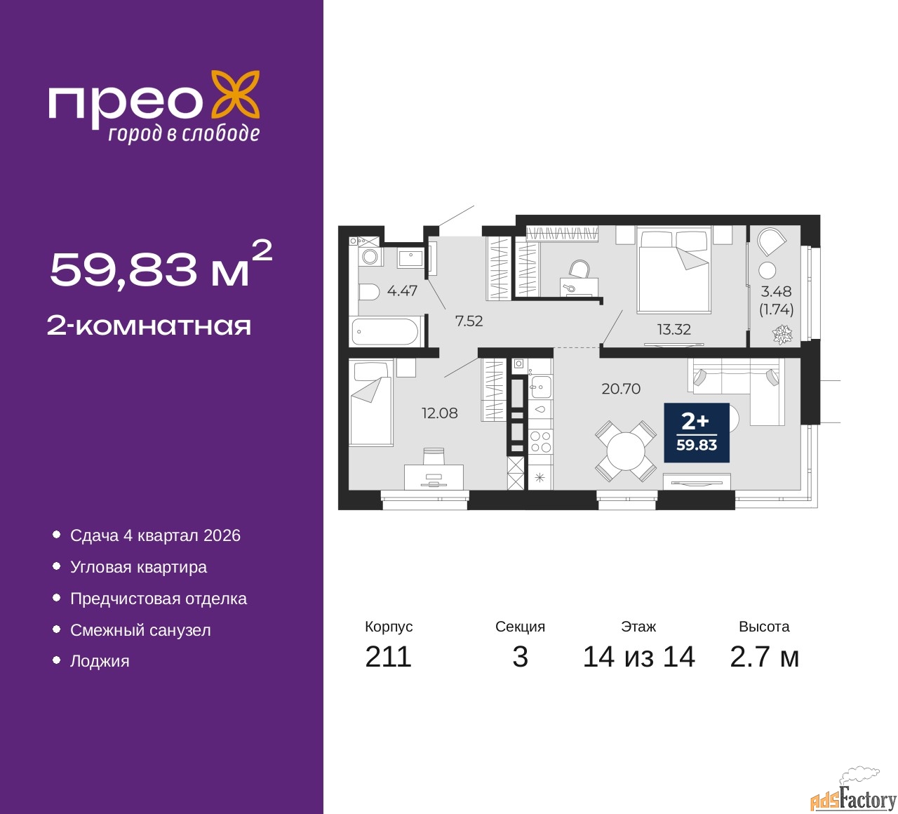 Дом монолитный, черырехподъездный, переменной этажности, от 14 до 21 этажей. Квартира находится в 3-й секции высотой 14 этажей в корпусе 211. На этаже 6 квартир. В подъезде 1 пассажирский и 1 грузовой лифт. Окончание строительства - 4 квартал 2026 года. Оформление сделки по договору долевого участия.