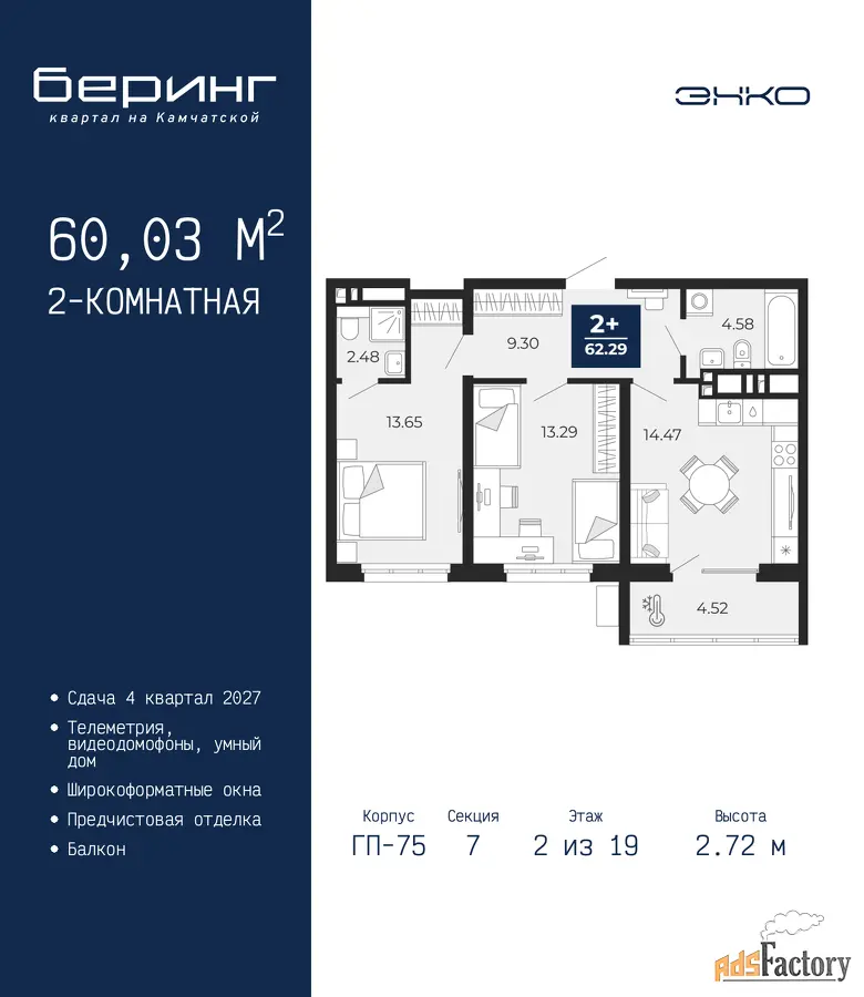 Дом монолитный, многоподъездный, переменной этажности, от 17 до 24 этажей. Квартира находится в 7-й секции высотой 19 этажей в корпусе ГП-75. На этаже 7 квартир. В подъезде 2 пассажирских и 1 грузовой лифт. Окончание строительства - 4 квартал 2027 года. Оформление сделки по договору долевого участия.