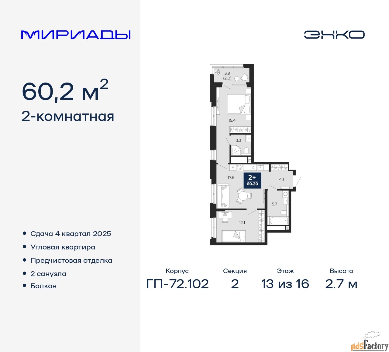 Дом монолитный, многоподъездный, переменной этажности, от 14 до 16 этажей. Квартира находится во 2-й секции высотой 16 этажей в корпусе ГП-72.102. На этаже 6 квартир. В подъезде 1 пассажирский и 1 грузовой лифт. Окончание строительства - 4 квартал 2025 года. Оформление сделки по договору долевого участия.