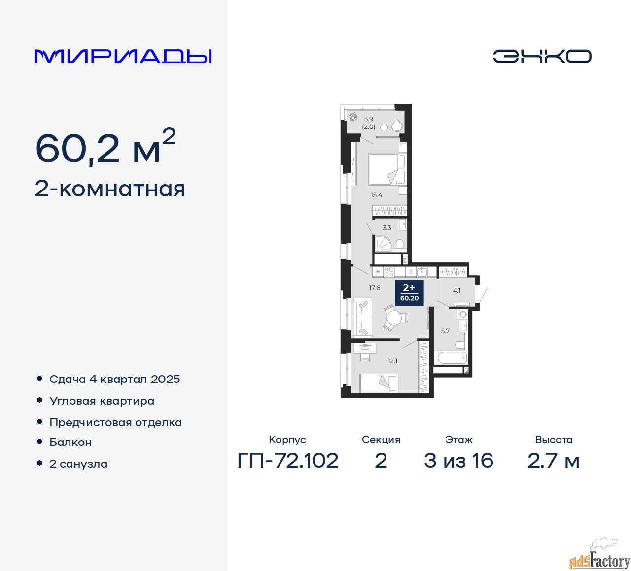 Дом монолитный, многоподъездный, переменной этажности, от 14 до 16 этажей. Квартира находится во 2-й секции высотой 16 этажей в корпусе ГП-72.102. На этаже 6 квартир. В подъезде 1 пассажирский и 1 грузовой лифт. Окончание строительства - 4 квартал 2025 года. Оформление сделки по договору долевого участия.