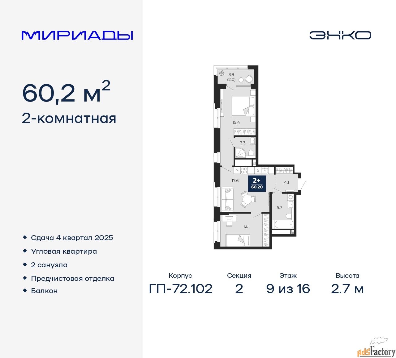 Дом монолитный, многоподъездный, переменной этажности, от 14 до 16 этажей. Квартира находится во 2-й секции высотой 16 этажей в корпусе ГП-72.102. На этаже 6 квартир. В подъезде 1 пассажирский и 1 грузовой лифт. Окончание строительства - 4 квартал 2025 года. Оформление сделки по договору долевого участия.