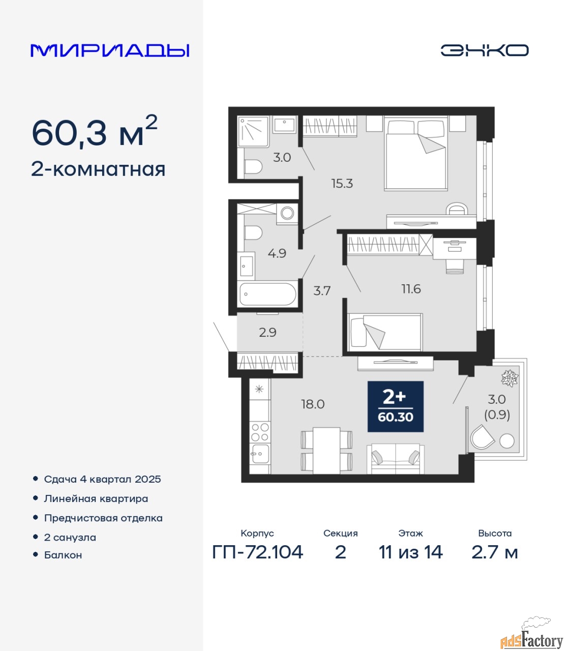 Дом монолитный, двухподъездный, переменной этажности, от 14 до 18 этажей. Квартира находится во 2-й секции высотой 14 этажей в корпусе ГП-72.104. На этаже 8 квартир. В подъезде 1 пассажирский и 1 грузовой лифт. Окончание строительства - 1 квартал 2026 года. Оформление сделки по договору долевого участия.