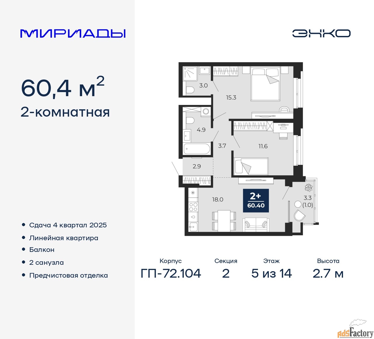 Дом монолитный, двухподъездный, переменной этажности, от 14 до 18 этажей. Квартира находится во 2-й секции высотой 14 этажей в корпусе ГП-72.104. На этаже 8 квартир. В подъезде 1 пассажирский и 1 грузовой лифт. Окончание строительства - 4 квартал 2025 года. Оформление сделки по договору долевого участия.