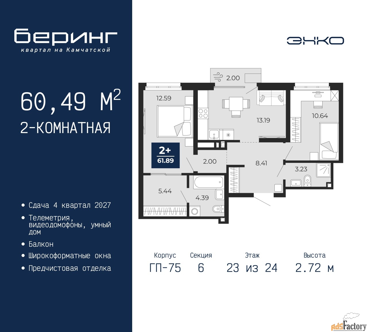| Высота потолков (м.) | 2.72 |