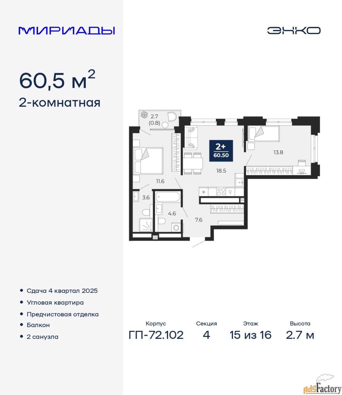 Дом монолитный, многоподъездный, переменной этажности, от 14 до 16 этажей. Квартира находится в 4-й секции высотой 16 этажей в корпусе ГП-72.102. На этаже 6 квартир. В подъезде 1 пассажирский и 1 грузовой лифт. Окончание строительства - 1 квартал 2026 года. Оформление сделки по договору долевого участия.