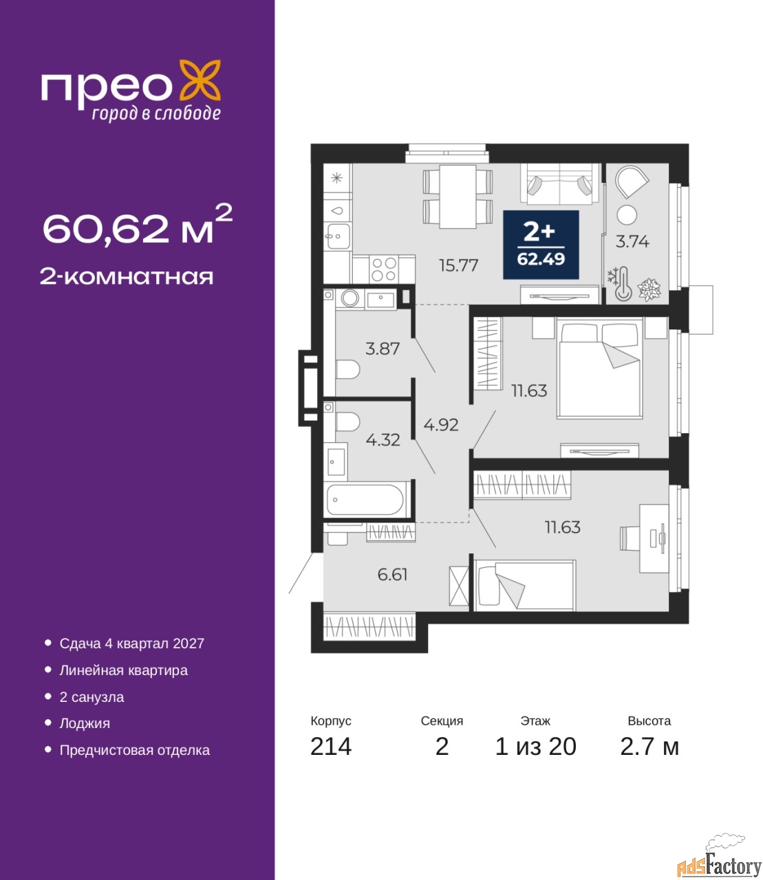 Дом монолитный, двухподъездный, переменной этажности, от 12 до 20 этажей. Квартира находится во 2-й секции высотой 20 этажей в корпусе 214. На этаже 8 квартир. В подъезде 1 пассажирский и 1 грузовой лифт. Окончание строительства - 4 квартал 2027 года. Оформление сделки по договору долевого участия.
