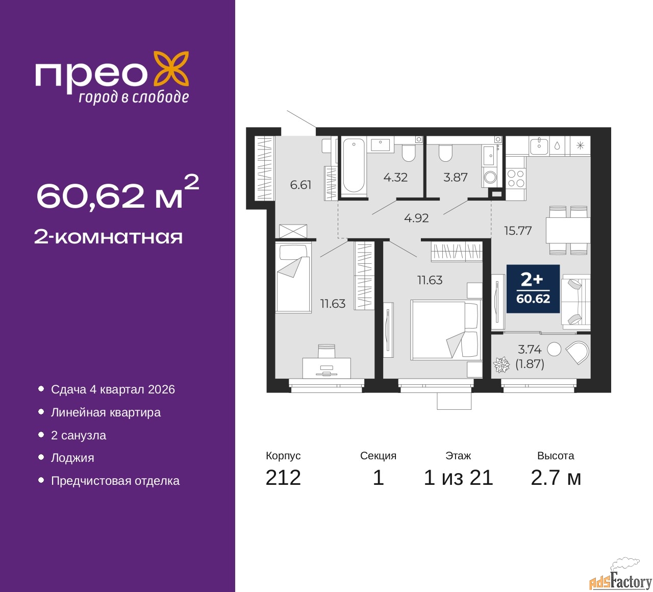 | Общая площадь (кв.м) | 60.62 |