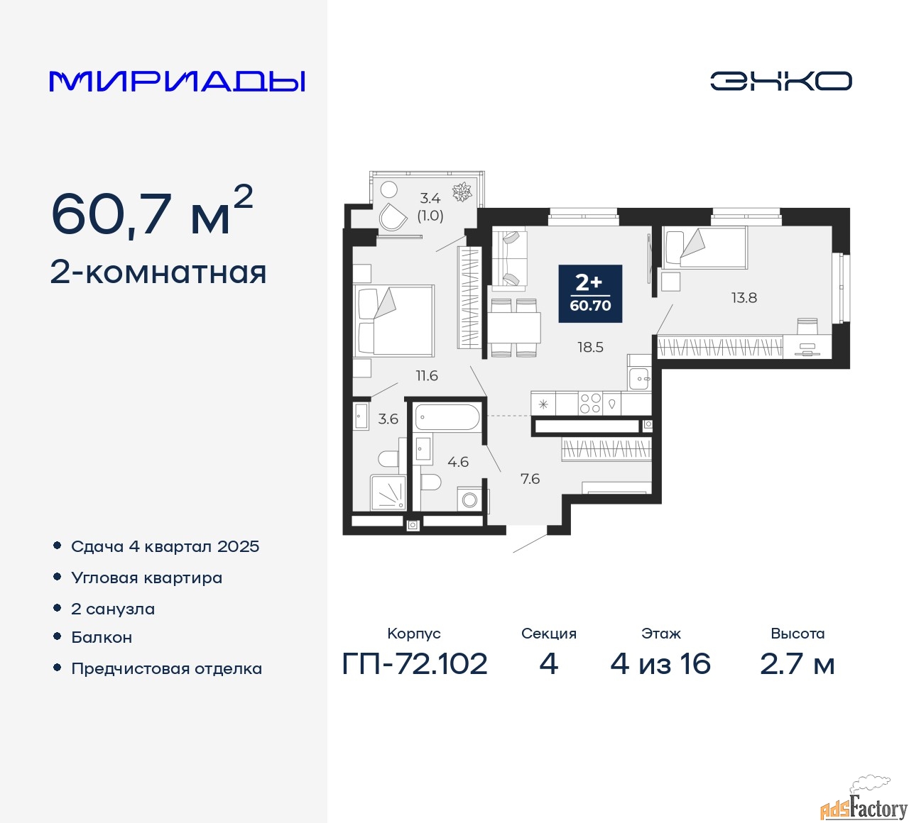 | Высота потолков (м.) | 2.7 |