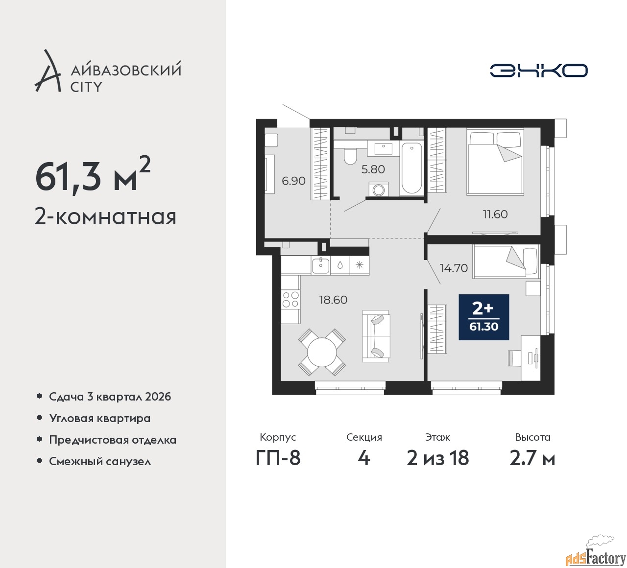 Дом монолитный, многоподъездный, переменной этажности, от 14 до 24 этажей. Квартира находится в 4-й секции высотой 18 этажей в корпусе ГП-8. На этаже 6 квартир. В подъезде 1 пассажирский и 1 грузовой лифт. Окончание строительства - 3 квартал 2026 года. Оформление сделки по договору долевого участия.