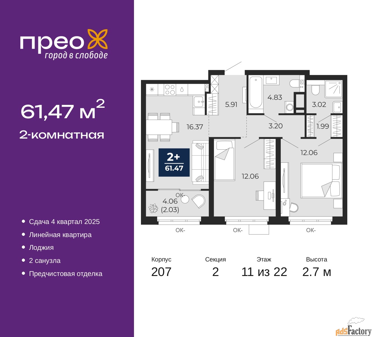 Дом монолитный, двухподъездный, высотой 22 этажа. Квартира находится во 2-й секции в корпусе 207. На этаже 8 квартир. В подъезде 1 пассажирский и 1 грузовой лифт. Окончание строительства - 4 квартал 2025 года. Оформление сделки по договору долевого участия.