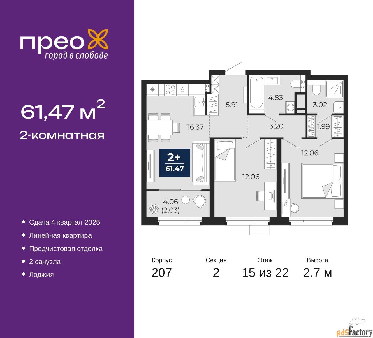 Дом монолитный, двухподъездный, высотой 22 этажа. Квартира находится во 2-й секции в корпусе 207. На этаже 8 квартир. В подъезде 1 пассажирский и 1 грузовой лифт. Окончание строительства - 4 квартал 2025 года. Оформление сделки по договору долевого участия.