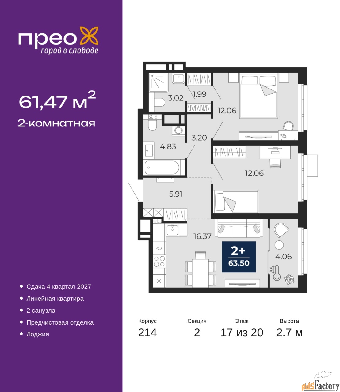 Дом монолитный, двухподъездный, переменной этажности, от 12 до 20 этажей. Квартира находится во 2-й секции высотой 20 этажей в корпусе 214. На этаже 8 квартир. В подъезде 1 пассажирский и 1 грузовой лифт. Окончание строительства - 4 квартал 2027 года. Оформление сделки по договору долевого участия.