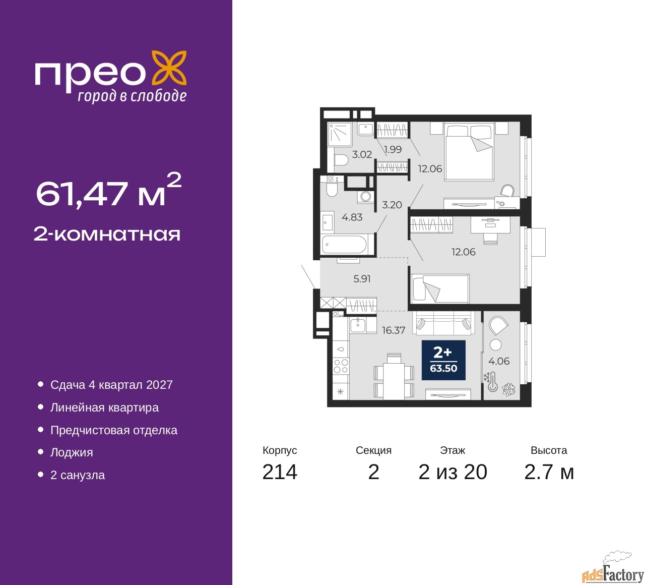 Дом монолитный, двухподъездный, переменной этажности, от 12 до 20 этажей. Квартира находится во 2-й секции высотой 20 этажей в корпусе 214. На этаже 8 квартир. В подъезде 1 пассажирский и 1 грузовой лифт. Окончание строительства - 4 квартал 2027 года. Оформление сделки по договору долевого участия.