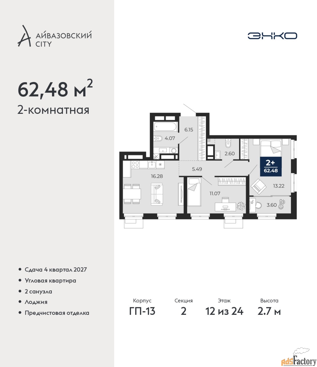 Дом монолитный, многоподъездный, высотой 24 этажа. Квартира находится во 2-й секции в корпусе ГП-13. На этаже 6 квартир. В подъезде 1 пассажирский и 1 грузовой лифт. Окончание строительства - 4 квартал 2027 года. Оформление сделки по договору долевого участия.