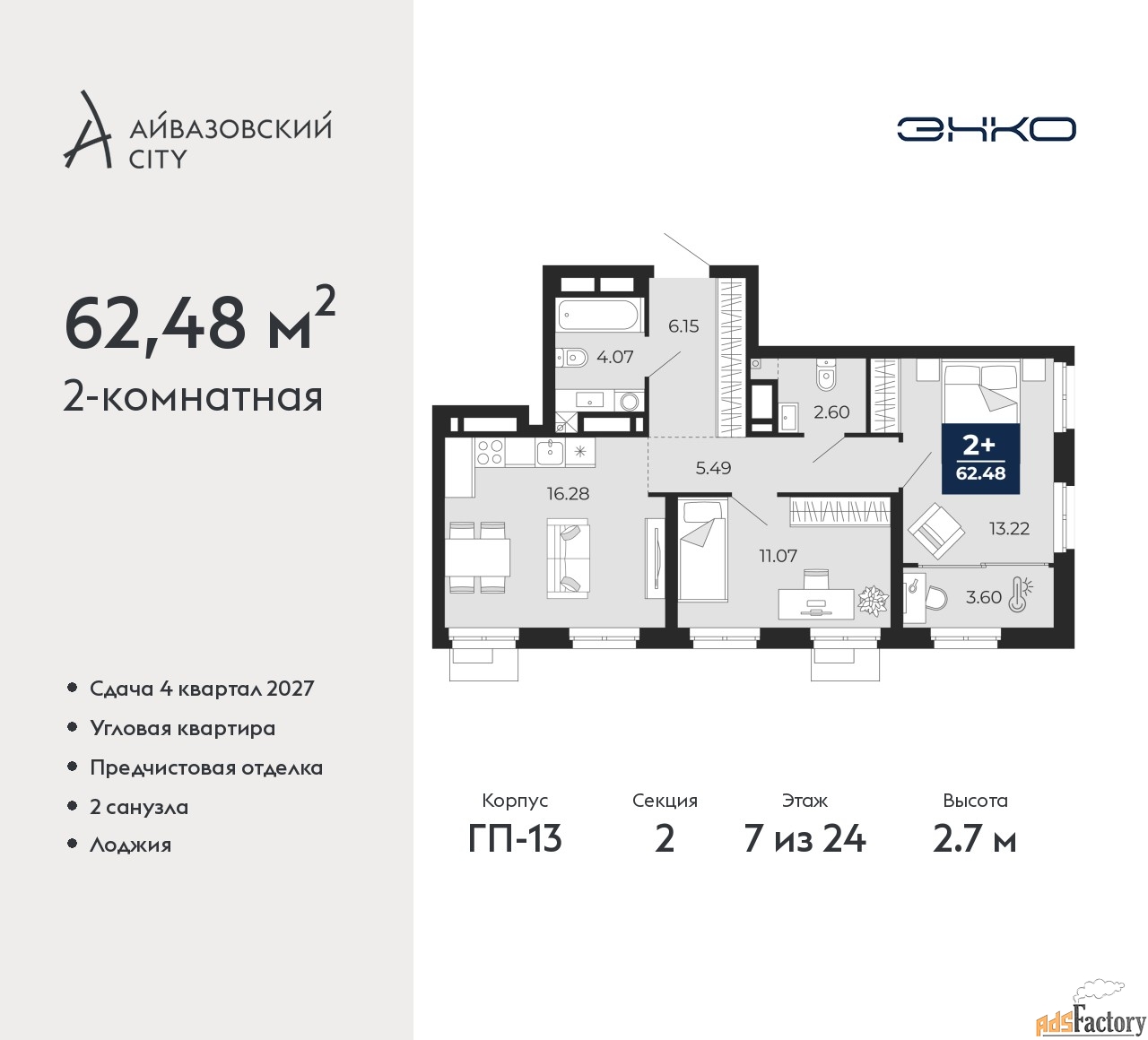 Дом монолитный, многоподъездный, высотой 24 этажа. Квартира находится во 2-й секции в корпусе ГП-13. На этаже 6 квартир. В подъезде 1 пассажирский и 1 грузовой лифт. Окончание строительства - 4 квартал 2027 года. Оформление сделки по договору долевого участия.