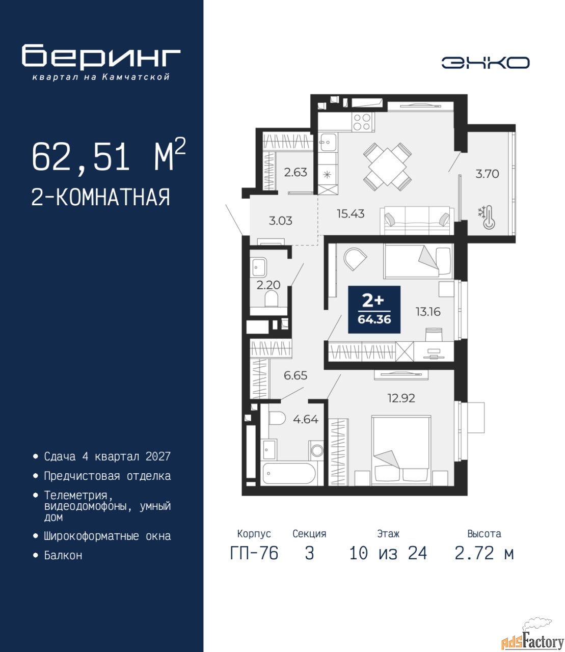 | Высота потолков (м.) | 2.72 |