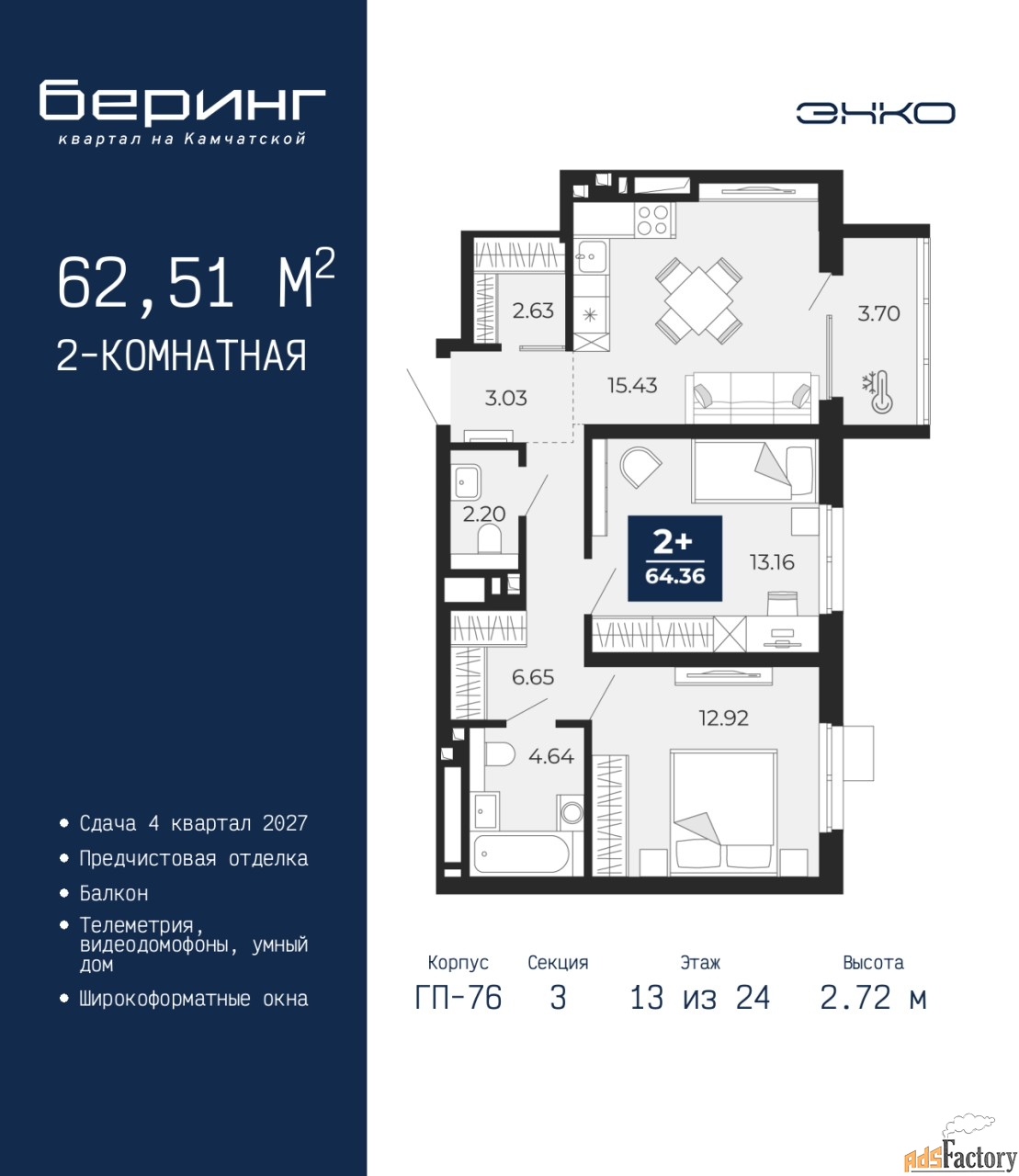 Дом монолитный, черырехподъездный, переменной этажности, от 19 до 24 этажей. Квартира находится в 3-й секции высотой 24 этажа в корпусе ГП-76. На этаже 6 квартир. В подъезде 1 пассажирский и 1 грузовой лифт. Окончание строительства - 4 квартал 2027 года. Оформление сделки по договору долевого участия.