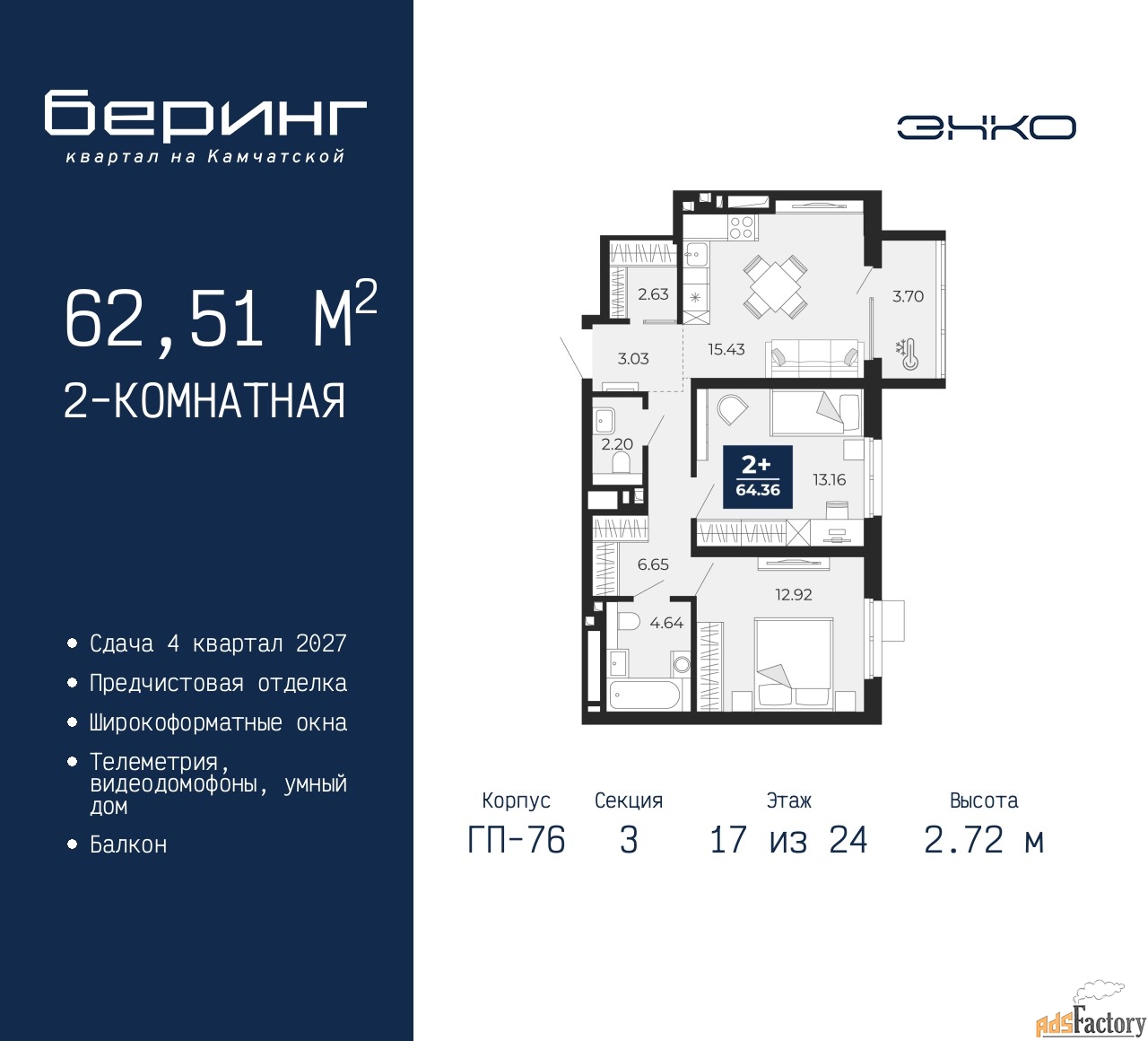 Дом монолитный, черырехподъездный, переменной этажности, от 19 до 24 этажей. Квартира находится в 3-й секции высотой 24 этажа в корпусе ГП-76. На этаже 6 квартир. В подъезде 1 пассажирский и 1 грузовой лифт. Окончание строительства - 4 квартал 2027 года. Оформление сделки по договору долевого участия.