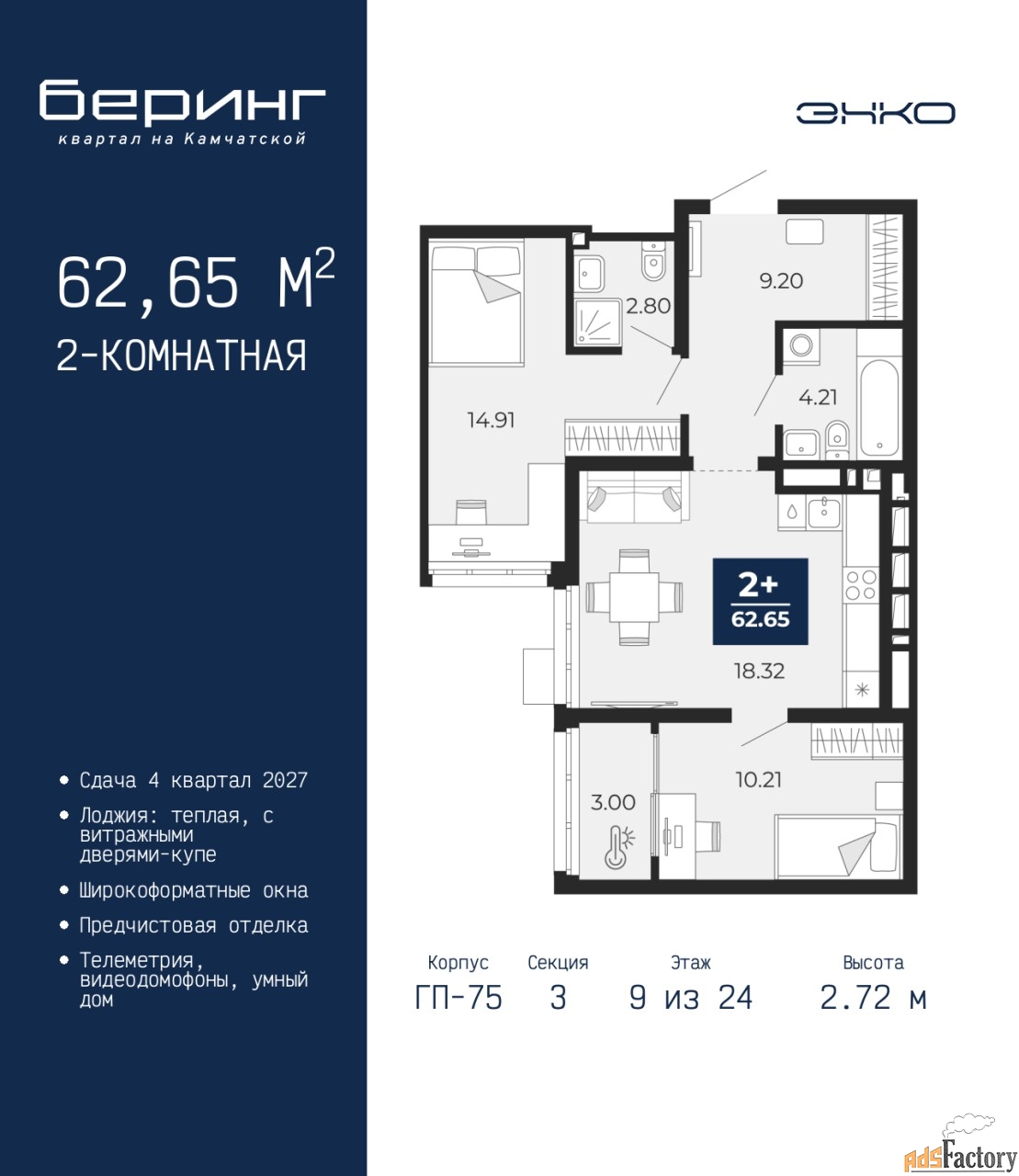 Дом монолитный, многоподъездный, переменной этажности, от 17 до 24 этажей. Квартира находится в 3-й секции высотой 24 этажа в корпусе ГП-75. На этаже 6 квартир. В подъезде 2 пассажирских и 1 грузовой лифт. Окончание строительства - 4 квартал 2027 года. Оформление сделки по договору долевого участия.