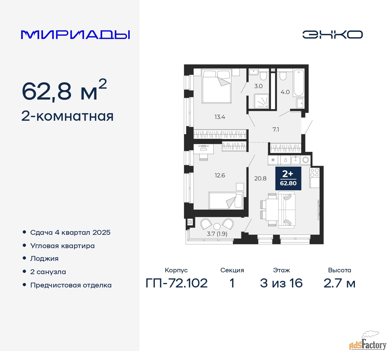 Дом монолитный, многоподъездный, переменной этажности, от 14 до 16 этажей. Квартира находится в 1-й секции высотой 16 этажей в корпусе ГП-72.102. На этаже 9 квартир. В подъезде 1 пассажирский и 1 грузовой лифт. Окончание строительства - 4 квартал 2025 года. Оформление сделки по договору долевого участия.