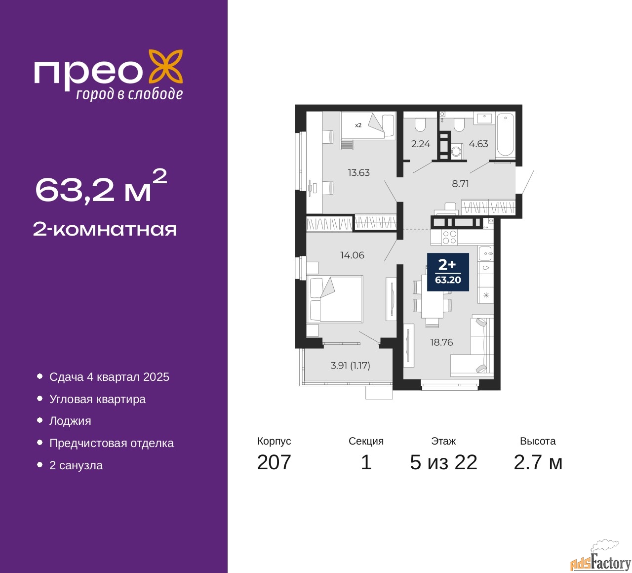 Дом монолитный, двухподъездный, высотой 22 этажа. Квартира находится в 1-й секции в корпусе 207. На этаже 8 квартир. В подъезде 1 пассажирский и 1 грузовой лифт. Окончание строительства - 4 квартал 2025 года. Оформление сделки по договору долевого участия.