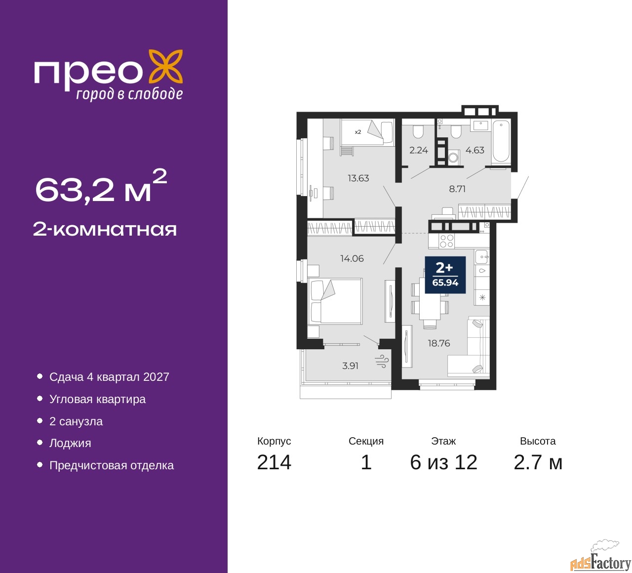 Дом монолитный, двухподъездный, переменной этажности, от 12 до 20 этажей. Квартира находится в 1-й секции высотой 12 этажей в корпусе 214. На этаже 8 квартир. В подъезде 1 пассажирский и 1 грузовой лифт. Окончание строительства - 4 квартал 2027 года. Оформление сделки по договору долевого участия.