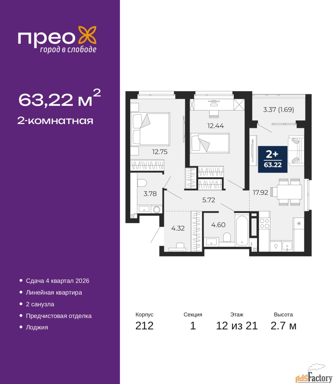 Квартира находится в корпусе 212. Дом монолитный, одноподъездный, высотой 21 этаж. На этаже 8 квартир. В подъезде 2 пассажирских и 1 грузовой лифт. Окончание строительства - 4 квартал 2026 года. Оформление сделки по договору долевого участия.