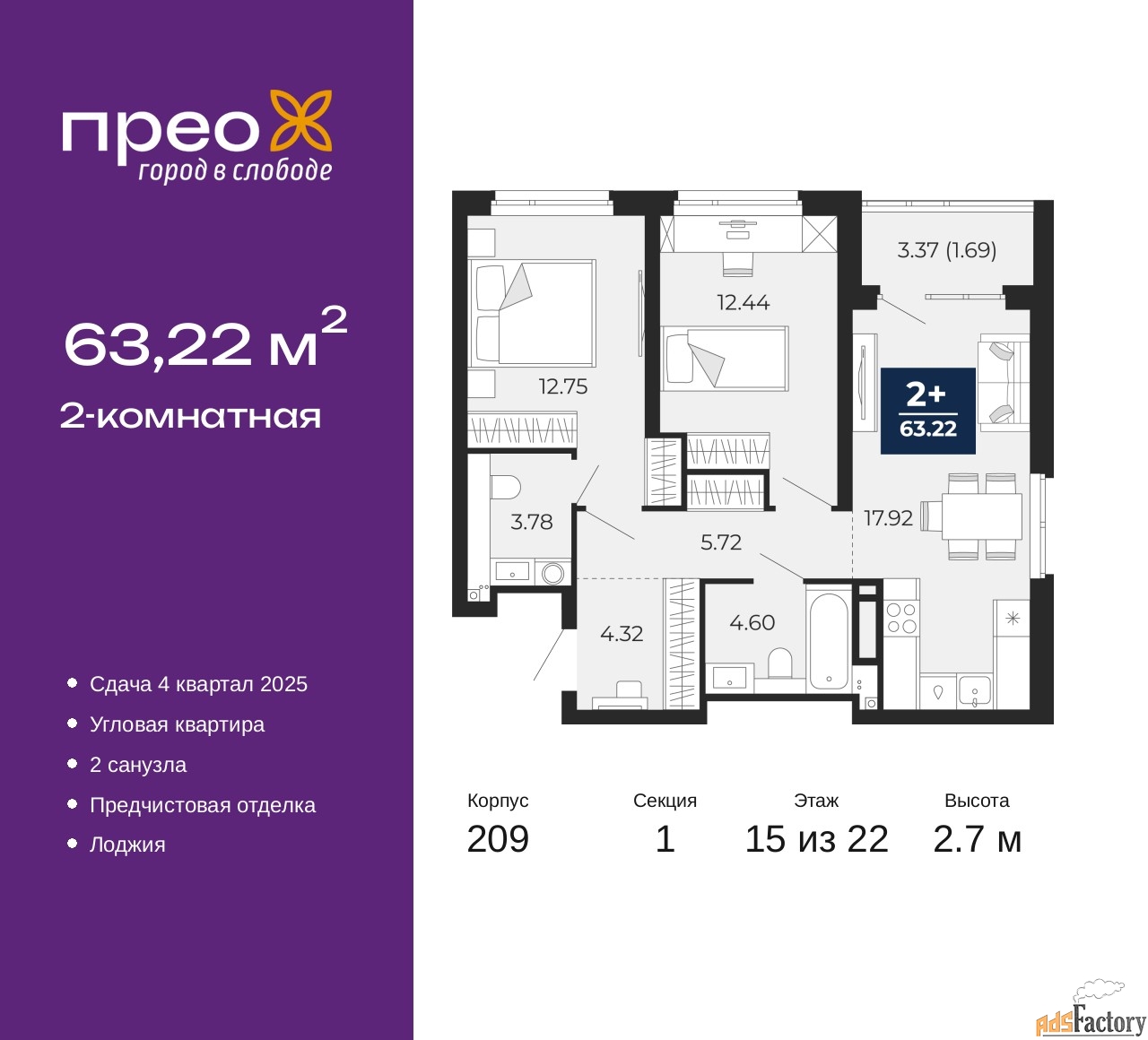 Квартира находится в корпусе 209. Дом монолитный, одноподъездный, высотой 22 этажа. На этаже 8 квартир. В подъезде 1 пассажирский и 1 грузовой лифт. Окончание строительства - 4 квартал 2025 года. Оформление сделки по договору долевого участия.