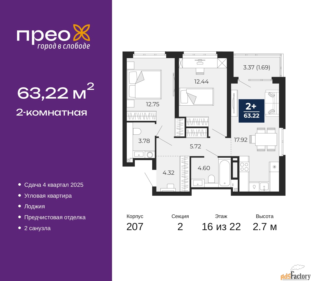 Дом монолитный, двухподъездный, высотой 22 этажа. Квартира находится во 2-й секции в корпусе 207. На этаже 8 квартир. В подъезде 1 пассажирский и 1 грузовой лифт. Окончание строительства - 4 квартал 2025 года. Оформление сделки по договору долевого участия.