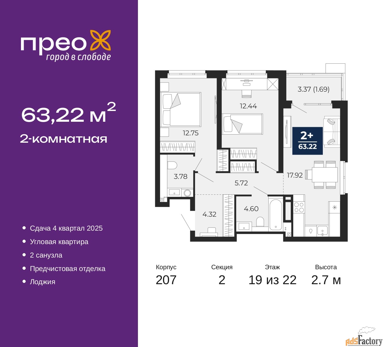 Дом монолитный, двухподъездный, высотой 22 этажа. Квартира находится во 2-й секции в корпусе 207. На этаже 8 квартир. В подъезде 1 пассажирский и 1 грузовой лифт. Окончание строительства - 4 квартал 2025 года. Оформление сделки по договору долевого участия.